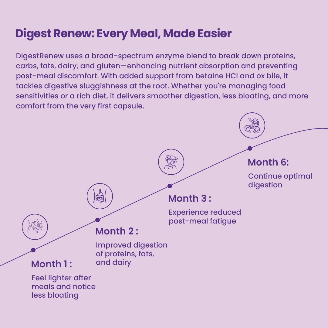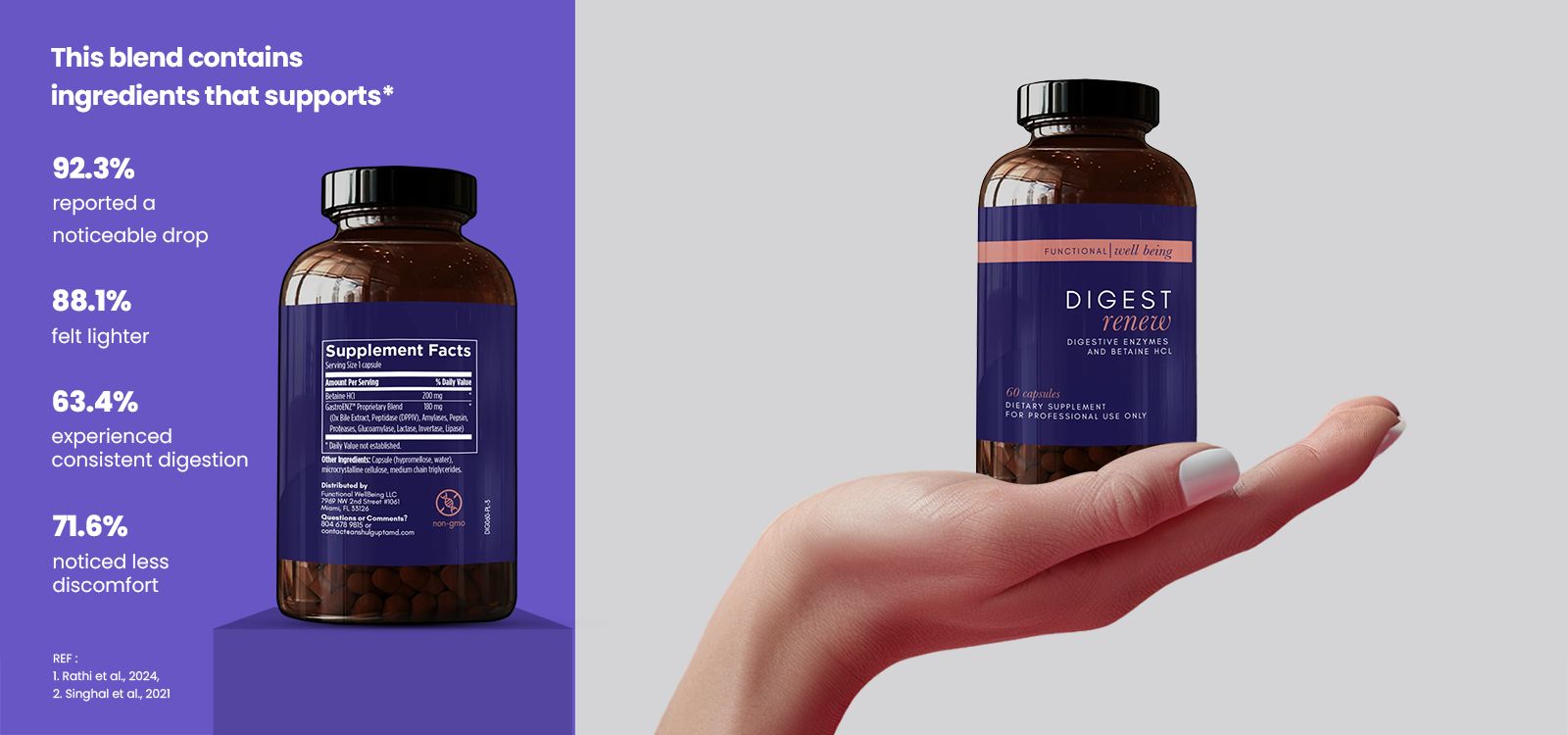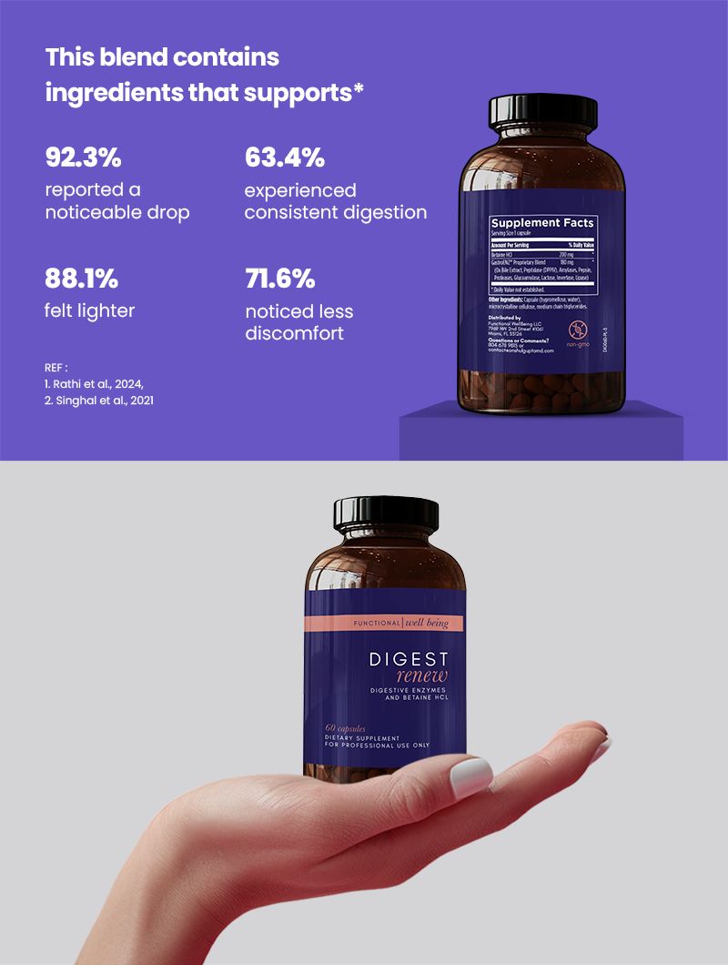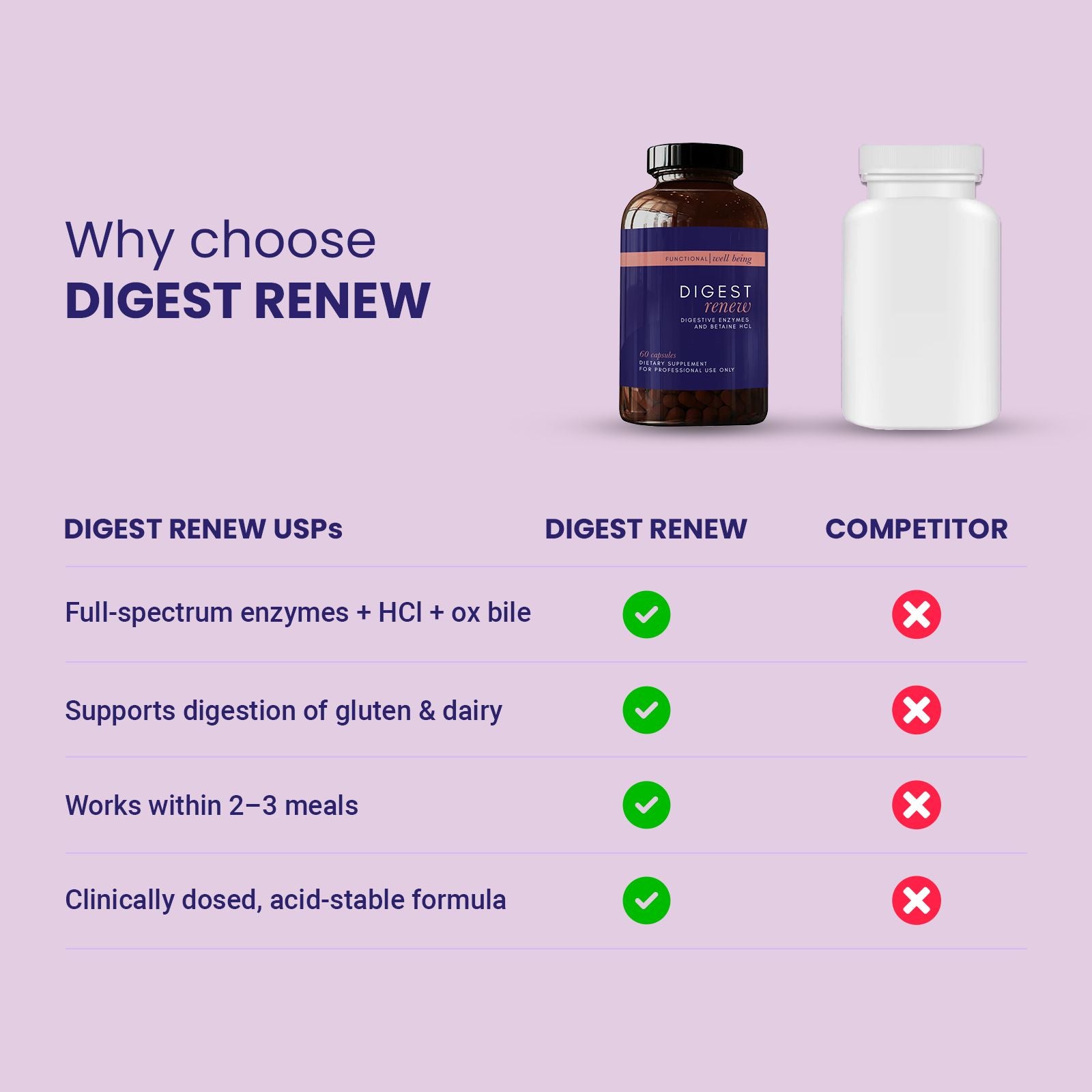 Digest Renew is the perfect addition to your daily routine for better digestion! Our proprietary blend of digestive enzymes work with betaine hydrochloride (HCl) to help break down proteins, fats, and carbohydrates.